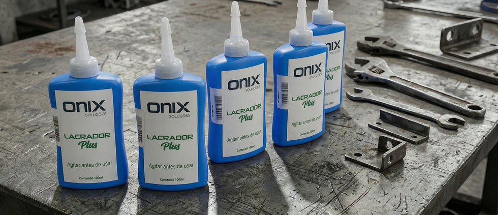 O produto é o Lacrador Industrial Onix Plus, uma solução química projetada para oferecer segurança e garantia industrial ao lacrar e fixar componentes.